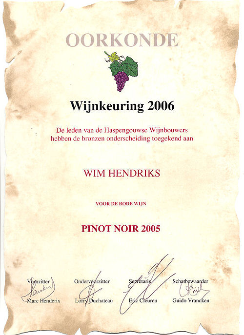Op 11 november 2006 was er feest van de Haspengouwse wijnboeren i.v.m. het 10-jarig bestaan van de vereniging bij Wijnkasteel Genoels-Elderen. Onze Belgische vrienden dragen wij een warm hart toe en wij zijn uiteraard aangesloten bij hun vereniging. Tijdens de feestdag werden we verguld met een oorkonde m.b.t. onze Pinot Noir 2005. Heel verrassend vonden we het. We zijn er blij mee.
